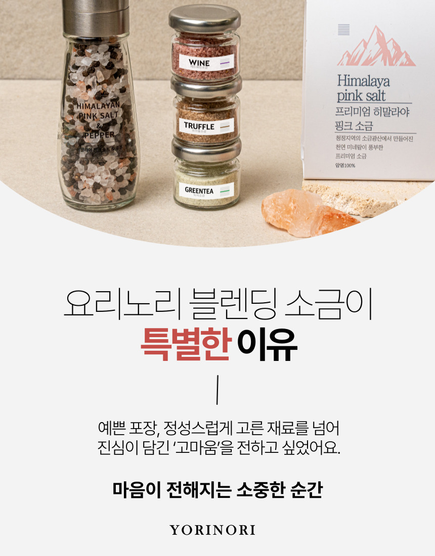 가장 합리적인 가격으로 만나는 프리미엄. 요리노리 프리미엄 소금 시리즈를 소개합니다. 행복한 날 특별함을 더해보세요.